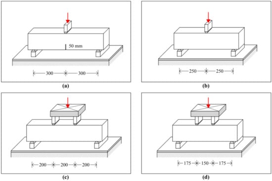 Within the experimental program, two variants of four-point bending tests were carried out. The test indicated as 4B600 was calibrated for the specimen with a nominal size of 150 × 150 × 700 mm, a span between supports of 600 mm, and a distance between the supports and loading forces of 200 mm. The second variant of the four-point bending test, indicated as 4B500, was calibrated for the specimen with a nominal size of 150 × 150 × 600 mm and a span between supports of 500 mm. This test differs from the previous one by the position of the loading forces (Figure 5).