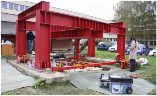 Load tests of structural elements or their parts, together with laboratory testing of material characteristics, provide very valuable knowledge about material behaviors in real structures, such as bending and shear load capacity [,,], and can help with numerical analysis specifications (Figure 2).