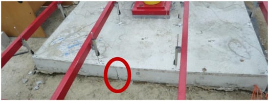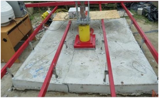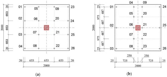 The load was gradually applied through a steel plate with dimensions of 400 × 400 mm in loading steps until slab failure (see Figure 9). The load steps for slab G01 were 25 kN/30 min, and those for slabs G02, G03, and G04 were 75 kN/30 min. In the course of testing, slab deformation was measured by 16 deformation sensors with an accuracy of 0.01 mm. A diagram of the regular arrangement of deformation sensors is shown in Figure 10.