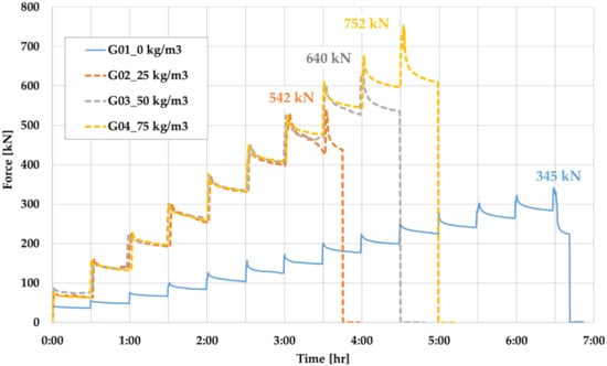 All other slabs were loaded with loading steps of 75 kN/30 min. The load diagram shows the apparent effects of the volume of fibers on the total load capacity of the fiber concrete slab. The load capacity of slab G02 is 542 kN, that of slab G03 is 640 kN, and that of slab G04 is 752 kN.