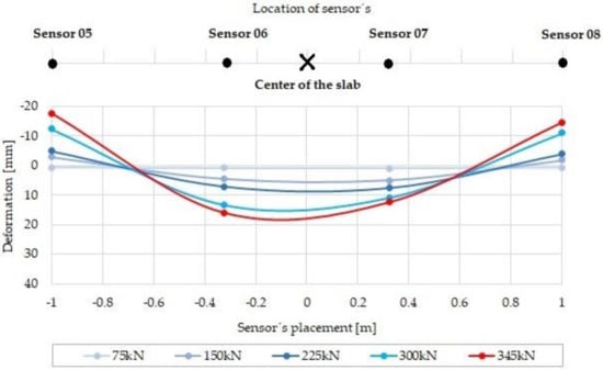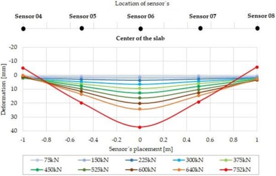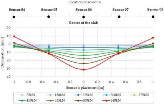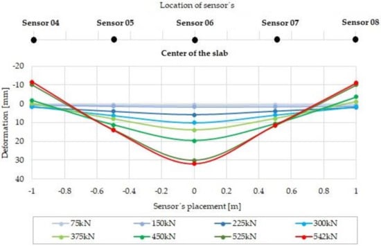 The measured deformation for the particular load steps of slab G04 made of fiber concrete with a 75 kg/m3 dosage of fibers is shown in Figure 15. The course of deformation occurs in the slab section that corresponds to the position of displacement sensors 04 to 08 (see Figure 10b). The maximum measured positive deformation was 37.28 mm (sensor 06), and the maximum negative deformation was 5.81 mm (sensor 08).