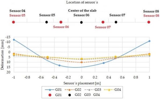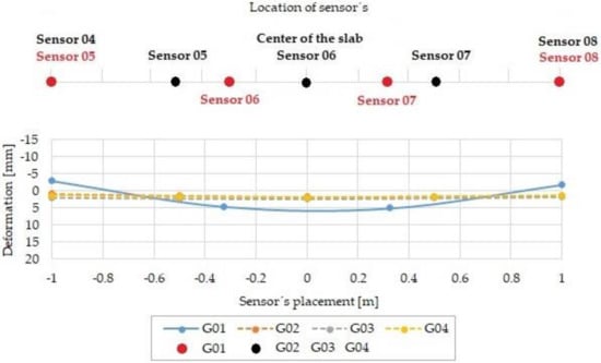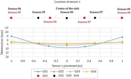 Figure 19 provides a comparison of the deformation measured in the fourth load step, which responds to a loading force 300 kN. Very significant deformations of the slab G01 predict that the load capacity will be exceeded. The trend of deformation development of the slabs G02, G03, and G04 is the same as that in the previous load step, and there are still zero negative deformations. The specific measured values are ordered in Table 6.