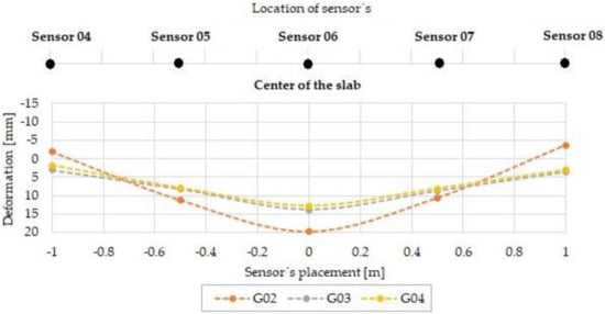 Figure 20 shows a comparison of the deformation measured in the fifth load step, which responds to a loading force 450 kN. Positive deformation of the slab G02 produced noticeable values, and small negative deformation appeared. Slabs G03 and G04 retain small positive and zero negative deformations. The specific measured values are ordered in Table 6.