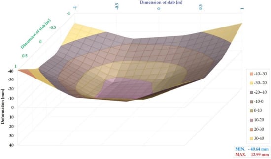On the basis of the deformation measured with 16 displacement sensors, interpolation of the intermediate values was performed and processed into a 3D deformation chart. Figure 21, Figure 22, Figure 23 and Figure 24 provide charts of 3D deformation for a load force 300 kN (the fourth load step).