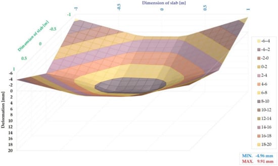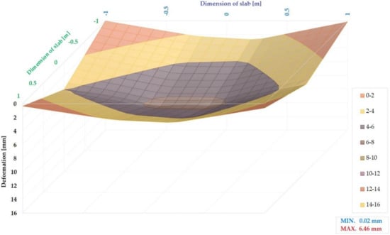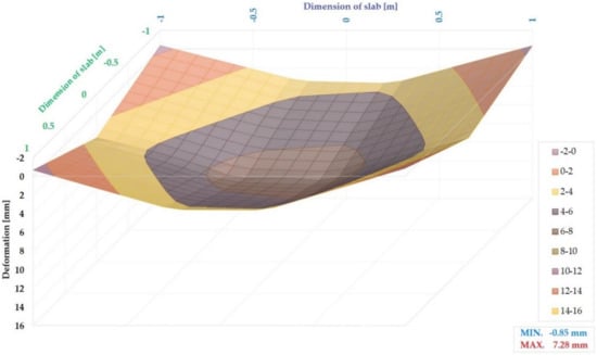 Figure 24 shows a 3D model of the G04 slab deformation exposed to a 300 kN load. The maximum positive deformation is 6.46 mm, and negative deformation did not appear in this load step.