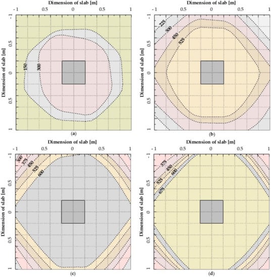 Figure 25 shows the gradual negative deformation with an increasing value of the loading force. The negative deformation of the slab corners for each slab is expressed with the zero deformation line for a particular load step. For the G01 slab, negative deformation appeared by the second load step (Figure 25a). Negative deformation appeared in the load step 225 kN for the G02 slab (Figure 25b) and in the load step 300 kN for the slab G03 (Figure 25c). For slab G04, negative deformation in the corners did not appear until the load step of 375 kN (Figure 25d).