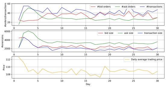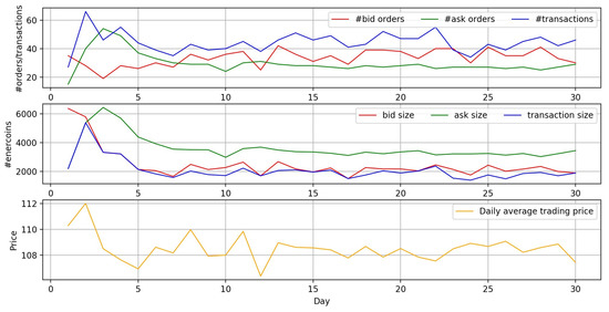 On the asking side, it is assumed that nodes with green ratios greater than the community level would like to sell their extra coins and put ask orders. The ask amount and price are simulated according to Equation (4). The ask price is mainly determined by the base price of igreencoins and the norm factor, since the demand will be higher with a higher norm factor. Additionally, a random factor is included to reflect the preference of different offerers, which is set as an integer uniformly distributed in the range of [0, 15]. The ask amount is positively related to the excess of offerer’s green ratio over the community level, indicating that a household with a higher green ratio would like to sell more coins.