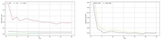 A higher norm factor also implies a higher willingness to pay for igreencoins. Accordingly, bid price and amount are simulated based on the norm factor and bidder’s deviation from the social norm—the difference between her green ratio and the community green ratio, as in Equation (3). The base price is set as 100. With a larger green ratio lag and a higher norm factor, bidders are willing to buy more igreencoins with a higher price.