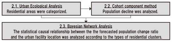 The method of this study involves three steps in Figure 2. First, residential areas are categorized by urban ecological analysis. Second, the residential clusters with rapidly decreasing populations in the Osaka metropolitan area are analyzed via cohort analysis. Finally, the causal relationship between the forecasted population change ratio and the locations of urban facilities is analyzed via Bayesian network analysis according to the residential clusters.