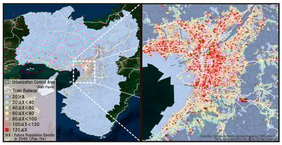 The D2040 of each NA was calculated using the cohort component method in Section 2.2. Then, the forecasted population density of each NA was calculated and drawn on a map in Figure 4. Figure 4 shows that the forecasted population density was affected by the residential clusters in Figure 3. Figure 4 shows that the population density will decline rapidly in the southern part of the Osaka metropolitan area.