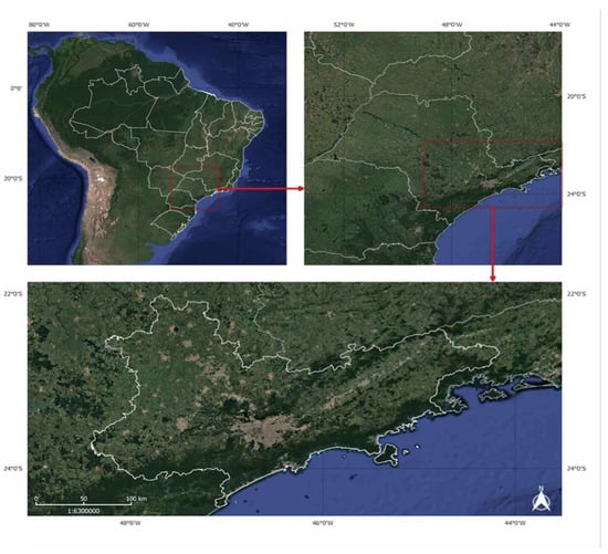 This study seeks to contribute to the climate debate on the SPMM [5] by addressing climate change from an original and interdisciplinary perspective. The SPMM region is composed of 174 municipalities, with more than 30 million inhabitants and covers an area of approximately 53,000 km2. It is located in the southeastern part of São Paulo State (Figure 1) and is comprised of five metropolitan regions (São Paulo, Campinas, Baixada Santista, Vale do Paraíba and Litoral Norte, and Sorocaba), two urban agglomerations (Jundiaí and Piracicaba), and a micro-region (Bragantina) [6]. Many aspects of this region have been analyzed by geographers, sociologists, economists, and urban planners, among others [7,8,9,10,11], due to its contemporary significance nationally and relevance for Latin America.