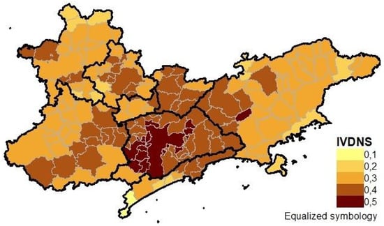 Five variables are also taken into consideration for the construction of the IVDNS based on socio-economic, demographic, land-use, and water management data: (1) infant mortality rate, (2) percentage of the population below the poverty line, (3) demographic density of municipalities, (4) water supply and demand, and the type of main sources for public supply, and (5) land-use. Regarding adaptive capacity, indices such as the illiteracy rate, Gini index, and Human Development Index (HDI) were taken into account.