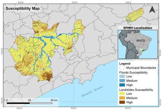 Three types of maps are used to diagnose other vulnerabilities such as landslide risks. Each map has a specific function and scale. The three main maps applied to territorial planning are Susceptibility Maps (SM)—scale 1:25,000, which depicts land compartments along with the possibility of occurrence of landslides and flooding processes in the compartments, based on the degree of susceptibility (high, medium, and low). Urban Aptitude Geotechnical Maps (UAGM)—scale 1:10,000, which aims to provide guidelines for land-use, considering the limits and potential of the physical environment based on its characteristics, in order to avoid new risk situations, and Risk Maps (RM)–scale ≤ 1:2000, which present the sectors affected by landslides, riverbank erosion, and floods and the respective degrees of risk, indicating the interventions to reduce risk through infrastructure measures. The map also indicates those houses that should be removed to avoid risk (Table 2). The SPMM Susceptibility Map (SM) was used for this study (Figure 4). The SM shows the degrees of susceptibility for landslides and floods for the municipalities that also experience drought risks. This information is important because it is challenging to manage disasters under scenarios of both excess and lack of water.