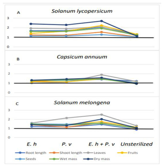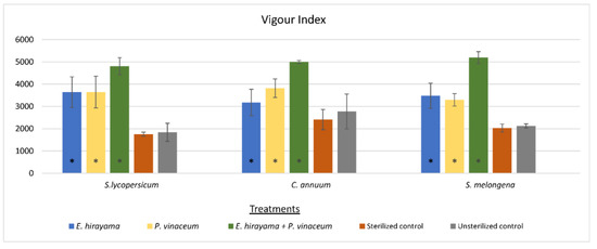 All of the plant-growth promotion measures were higher in the fungal treatments than in the sterilized control, as seen from the values relative to the sterilized control (Figure 2). Most values were also higher in unsterilized than unsterilized control. For the vigor index, the two-way ANOVA showed the significant effects of P. vinaceum and E. hirayamae, as well as their significant interaction for the three plant species (Figure 3). The highest vigor index was observed for S. melongena (5200) in the combined treatment of the two fungal species. The single fungal treatments gave about 25% lower indices. For comparison, in the sterilized control, the vigor index was less than half that of the combined treatment (2000). The t-test showed no difference in the vigor index between the sterilized control and the unsterilized control.