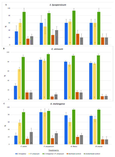 Germination of the seeds of three plants (S. lycopersicum, C. annuum, S. melongena) after exposure to four plant pathogens (F. solani, F. oxysporum, A. flavus, B. oryzae) and grown in the composts inoculated with two mangrove fungi (P. vinaceum and E. hirayamae) and their combination compared to sterilized waste control. Unsterilized control refers to the treatment of raw waste. * indicates a significant effect (p < 0.05) of the fungal species or a significant interaction (combined effect) in two-way ANOVA. a indicates a significant difference between the sterilized and unsterilized control treatments (t-test, p < 0.05).