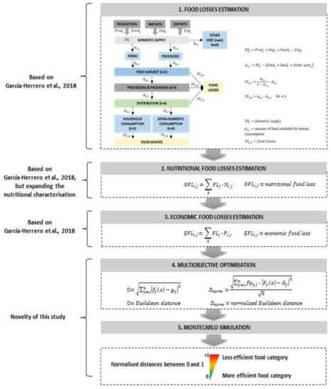 The methodology developed in this study aims to obtain an optimized indicator based on the normalized Euclidean distance between an individual solution and the optimization target, applying a “distance to target” approach. This single index combines both nutritional and economic variables, so it provides a useful tool to identify the most critical food categories and facilitates the decision-making process to design initiatives and policies for a better management of FLW. In addition, the distance values are normalized in the range between 0 and 1, so a direct and easily comparable outlook of the results is provided, which presents an important advantage over conventional multi-objective optimization methods. In this case, FLW along the Spanish FSC in 2015 was selected as a case of study. The food categories sourced were fruits, vegetables, cereals, milk and other dairy products, vegetable oils, fish, meat, pulses, roots and tubers, sugar, and eggs. More information about the case study can be found in [3].