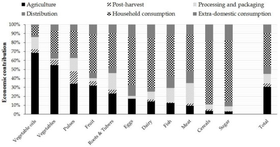 Regarding the economic assessment of the FLW, Figure 4 shows that the consumption stage gained the leading role at the expense of the agricultural stage. As shown on the right bar of the graph, almost 50% of the economic losses were produced at the consumption stage, both household (37%) and extra-domestic services (10%). Cereals (69.7%) and sugar (67.7%) were the food categories with the greatest economic losses. On the contrary, agriculture was the dominant stage for vegetables and vegetable oils, accounting for 68.3% and 54.9% of the costs, respectively. Post-harvest, processing and packaging, and distribution stages contributed 3.6%, 10.6%, and 8.2%, respectively, to the total economic losses, with the highest impact for pulses (14%) in post-harvest and meat (23% and 13.7%) in processing and packaging and distribution stages, respectively. Finally, concerning nutritional FLW, the trend was similar to mass FLW. According to Figure 5, 41% of global FLW corresponded to the agricultural production stage (right bar), with the highest contributions in vegetables oils (75.7%), vegetables (70.5%), and fruits (62.8%). The consumption stage represented 35.7% of the nutritional FLW, reaching household consumption 28% and extra-domestic consumption 7.8%. Cereals (55.4%) and milk and other dairy products (55.2%) were the food categories with a larger nutritional loss in this stage.