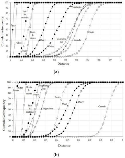 In Figure 10a, it is observed that practically all the food categories maintain their position from lowest to highest distance from the target compared to the results obtained by applying multi-objective optimization, except in specific cases (such as vegetables and vegetable oils or sugar and roots and tubers). In these cases, the corresponding curves have intersection points and the relative positions of these pairs of categories according to the distance to target vary.