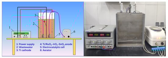 The experimental reactor consisted of a power supply, Ti/RuO2-IrO2-SnO2 anode, Ti cathode, aerator, and an electrocatalytic cell as shown in Figure 1. The electrocatalytic oxidation cell is made of quartz glass with a size of 250 × 160 × 280 mm. The built-in anode is a self-made Ti/RuO2-IrO2-SnO2 electrode plate. The cathode is a Ti plate purchased from Baoji Changli Special Metal Co., Ltd. The electrodes were connected to power supply to install the reactor. The reactor is an improved parallel structure reactor with a shared-anode and double electrolytic cells, that is, it is composed of one anode plate and two cathode plates. The effective area of the anode plate immersed in solution is 250 × 250 × 2 mm. This device can double the treatment capacity of organic pollutants without increasing the area of the electrolytic cell, and effectively improve the utilization efficiency of the anode plate.