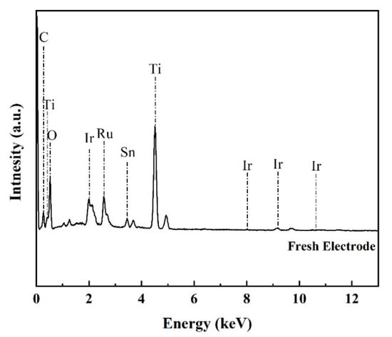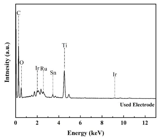 The EDS spectrum of the coating on the RuO2-IrO2-SnO2 anode showed that Sn, Ru, Ir, Ti, C and O were on the electrode surface (as shown in Figure 3). This indicated that RuO2, IrO2, and SnO2 were successfully coated on the Ti plates. The C signal comes from the presence of adventitious carbon on the electrode surface. The observed titanium signal may be due to the inability of the oxide coating to completely cover the surface of the titanium substrate. In addition, we obtain the percentage of element content on the electrode surface through EDS analysis (as shown in Table 2). The weight percentages of Ti, Ru, Ir and Sn are 27.37, 8.71, 4.56 and 7.47%, respectively. After calculation, it is found that there are 17.16% of RuO2, 0.33% of IrO2, and 14.19% SnO2 on the surface of the Ti plate, respectively. The high concentration of ruthenium oxide is located in the electrode, which not only provides more active sites for electrocatalytic oxidation, but also enhances the stability and life of the electrode.