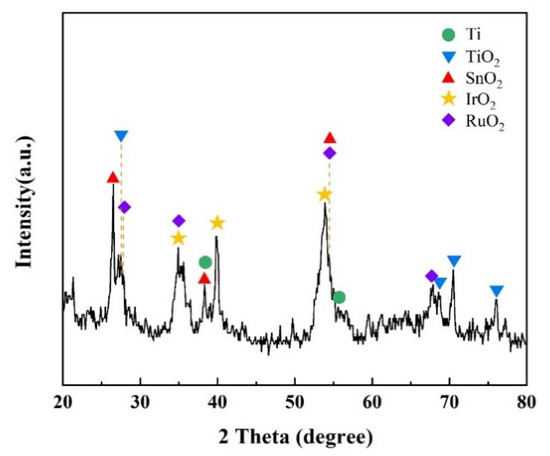 Furthermore, the crystal structure and chemical composition of the electrode was also evaluated by the XRD technique, and given in Figure 4. Obviously, the identified phases were RuO2 (JCPDS: 40-1290), IrO2 (JCPDS: 15-0870), SnO2 (JCPDS: 70-4177), Ti (JCPDS: 44-1288) and TiO2 (JCPDS: 01-1292, 04-0477). Except for the above diffraction peaks, there are no other obvious diffraction peaks in the XRD pattern. For Ti/RuO2-IrO2-SnO2 electrode plate, the diffraction angle 2θ is 28.009°, 35.050°, 54.245°,66.989 corresponding to the (110), (101), (211), (112)crystal planes of RuO2, the diffraction angle 2θ is 34.714°, 40.062°, 50.024° corresponding to the (101), (200), (211) crystal planes of IrO2, the diffraction angle 2θ is 26.601°, 37.974°, 54.790° corresponding to the (110), (200), (220) crystal planes of SnO2. The Ti diffraction angle 2θ is 38.481°, 55.541°, corresponding to crystal planes (110) and (200), the rutile diffraction angle 2θ is 27.506°, 76.082°, corresponding to crystal planes (110) and (202), the anatase diffraction angle 2θ is 68.594°, 70.357°, corresponding to crystal planes (116) and (220). This indicates that there are thin layers of RuO2, IrO2, SnO2 and TiO2 on the electrode.