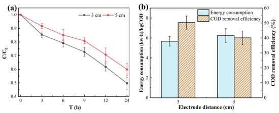 For the electrocatalytic oxidation, it was of interest to investigate the effect of electrode distance. At a current density of 1 mA/cm2, air flow of 12 L/min, pH of 7, as shown in Figure 5, When the electrode distance increased from 3 to 5 cm, the COD removal rate dropped by 10.2%. The experimental results indicated that the electrocatalytic performance with a plate spacing of 3 cm higher than a plate spacing of 5 cm. The reason was that when the distance between the plates is 5 cm, the distance between the two plates is too large, and the ion transmission distance between the two plates becomes longer, which increases the mass transfer resistance and weakens the mass transfer effect, thereby resulting in reduced electrochemical reaction efficiency [29,30]. Enhancing the electrode distance requires increasing the battery voltage output to maintain a constant current density. Under high voltage, not only energy consumption increase, but side reactions such as the release of hydrogen and oxygen will occur on the surface of the anode and cathode, which will reduce the efficiency of organic degradation [31,32].