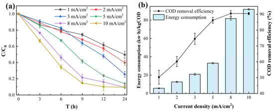 The current density has a significant impact on the COD removal effect of the electrocatalytic system, and directly affects the current transmission rate and treatment effect in the electrochemical reaction process. As shown in Figure 6b, in the process of enhancing the current density from 1 to 8 mA/cm2, the degradation efficiency showed the simultaneously increasing trend. With the increase in current density, the rate and intensity of charge transfer also increase, thereby promoting the formation of active intermediates and increasing the degradation efficiency of pollutant in wastewater [34,35]. It may be that the side reactions also occur on the electrode surface under too high current density, and the concentration of the active group decreases, thereby reducing the efficiency of reaction electrolysis and increasing energy consumption. At the same time, the tank voltage is too high, the bypass current and short-circuit current increase significantly, the temperature of the wastewater rises, and part of the electrical energy is converted into heat. Therefore, the best current density is 8 mA/cm2.