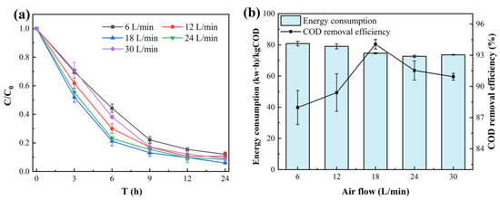 Obviously, a systematic investigation of the oxygen (or air) concentration in the reaction system is of great significance for improving the performance of electrocatalytic oxidation. Figure 7 shows the law of COD removal efficiency and energy consumption in wastewater when the air flow rate is increased from 6 L/min to 30 L/min. With the increase in air flow rate, the removal rate of COD in wastewater is increasing because the concentration of H2O2 produced by the system increases. The increase in air velocity increases the dissolved oxygen in the water, increases the cathode efficiency, and produces more H2O2, which promotes an increase in the removal rate of wastewater COD. When the rate reaches 18 L/min, the best COD removal rate is 94.06%, and the energy consumption is 74.63 (kW·h)/kgCOD. When the air velocity is higher than 18 L/min, the wastewater COD removal rate does not increase significantly with the increase in the air velocity, indicating that when the air velocity is higher than 18 L/min, the wastewater COD removal rate is mainly controlled by the electrochemical kinetics that produces H2O2. In addition, increasing the oxygen/air concentration in the catalytic reaction system promotes the formation of active oxygen species, thereby improving the removal efficiency of COD [38]. Excessively increasing the air flow makes it difficult for the organic pollutants in the wastewater to be effectively adsorbed on the electrode surface and react with active oxygen species, which causes the COD removal rate to gradually decrease [39,40]. The results further imply that the electrocatalytic degradation rate is the largest when the aeration amount is 18 L/min.
