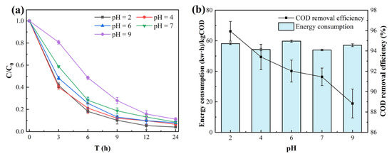 The initial pH value in the electrocatalytic reaction determines the reaction process and the direction of the chemical reaction, and the rate of hydrogen peroxide or hydroxyl radical at the cathode is affected by the initial pH (as shown in Figure 8). At electrode distance of 3 cm, the current density of 8 mA/cm2, air flow of 18 L/min, the COD removal rate increased with the decreasing pH as shown in Figure 8. The removal rate of COD was 91.45% at pH 7, and the energy consumption was 53.93(kW·h)/kgCOD. In this process, hydroxyl radicals play an important role in the removal of hard-degradable pollutants [41]. Under the dual action of the electric field and the DSA electrode, a large amount of ·OH is generated in the reactor [42,43]. Compared with pH 7, the COD removal rate was 95.92% and the energy consumption was to 58.09(kW·h)/kgCOD at pH 2. It may be because H2O2 is more easily produced in the reaction system at the lower pH (O2 +2H+ + 2e → H2O2), thereby further increasing the degradation efficiency [44].