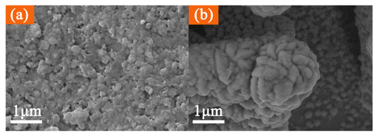 To further demonstrate the Ti/RuO2-IrO2-SnO2 electrode has excellent electrocatalytic ability and stability, we checked the surface morphology of the Ti/RuO2-IrO2-SnO2 electrode after long-term operation by SEM and EDS technology, and the results are given in Figure 9 and Figure 10. On the whole, the surface of the anode and cathode electrodes has undergone significant changes for a long time. For the cathode (Figure 9a), the smoothness of the surface of the Ti plate is reduced, and the surface has a coral-like structure. This may be due to the accumulation of organic molecules during the reaction. For the anode (Figure 9b), the surface smoothness of the Ti/RuO2-IrO2-SnO2 electrode also decreases, and a large number of granular structures are accumulated on the surface and cracks, with a particle diameter of about 300 nm. This may be due to the adsorption of a large amount of particulate organic on the surface of the oxide coating of the anode during the long-term reaction.