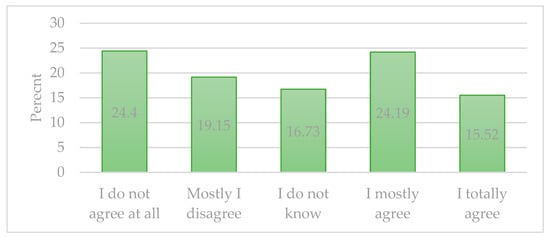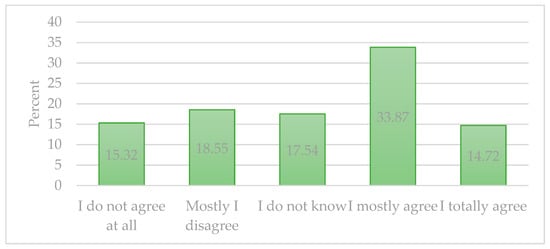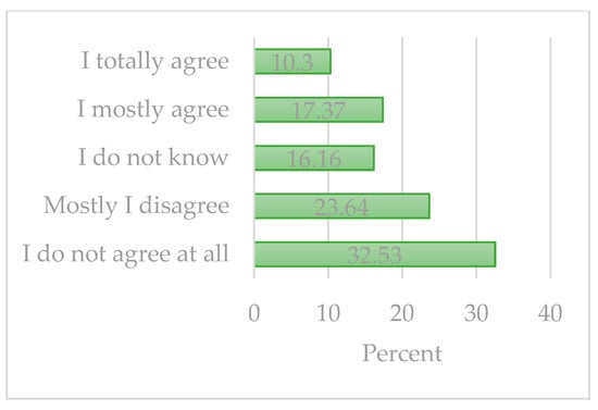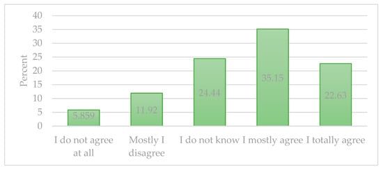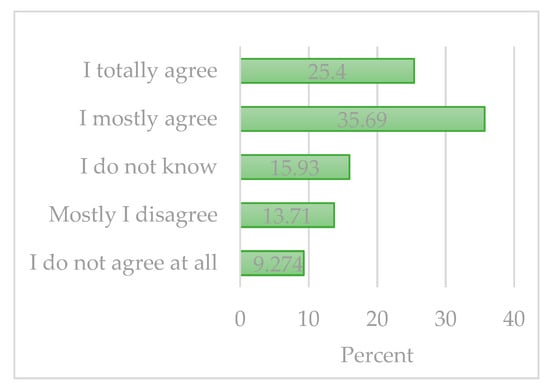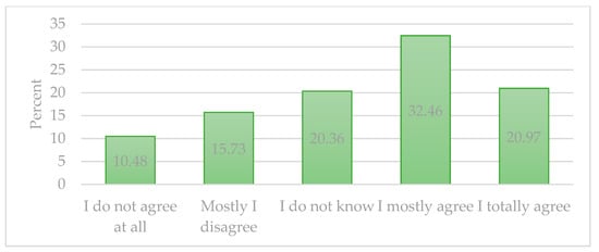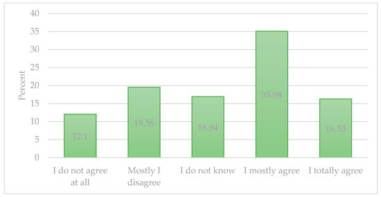 It was important in this study to discover the respondents’ opinion about the significance of conservation of nature and living in accordance with nature (Figure 7). A small percentage of respondents in the sample either strongly disagree or disagree with this statement (about 26%) while the percentage of those who agree with the statement is almost twice as large (53.43%). Correlation analysis shows that people with a higher level of education are more likely to hold this view, but the correlation is weak (the correlation coefficient r = 0.079). In addition, older people are more likely to hold this view (the correlation coefficient r = 0.090) as well as people with higher income, but the correlation is weak (the correlation coefficient r = 0.075).