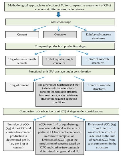 The authors of this paper suggest the following methodological approach for the selection of an FU for comparative assessment of the CF of concrete products (presented in Figure 1).