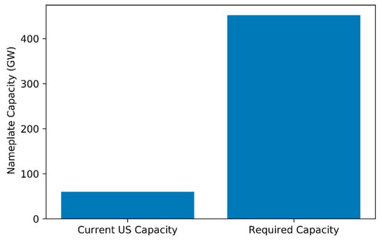 Comparison of Current US photovoltaic (PV) capacity and required PV capacity to meet 20% of 2019 US Electricity Generation (assuming capacity factor = 24.5%).