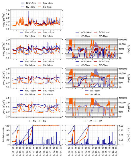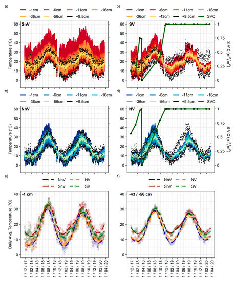 Five minute period time series of soil temperatures monitored at the SnV, SV, NnV and NV slopes are shown in Figure 4 (December 2017–April 2020), together with the maximum and minimum daily temperature measured at 9.5 cm above the surface. SVC evolution is also plotted for the vegetated slopes (Figure 4b,d). Figure 4e,f show smoothed time series at the shallower (−1 cm) and deeper (−43/56 cm) sensors in order to compare daily variations. They have been obtained using the Locally Estimated Scatterplot Smoothing (LOESS) [68] with smoothing parameter equal to 0.3.
