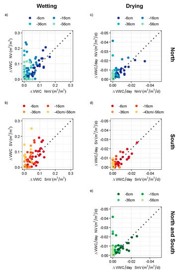 Comparison between changes of water contents (ΔVWC) at the same depth and for the same event in the four embankment slopes: (a) and (b) ΔVWC during infiltration in the North and South slopes; (c) and (d) ΔVWC (divided by drying period duration) during drying in the North and South slopes; (e) ΔVWC (divided by drying period duration) in the North vegetated and South non-vegetated slopes. Note: vegetated data correspond to the period when slopes were fully covered by vegetation (SVC = 1, from December 2018 to March 2020).