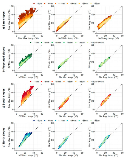 Another general aspect concerns the respective effect of orientation and vegetation. As shown in Figure 4e,f, highest mean daily temperatures have been measured in the SnV slope, then in the SV, NnV and NV slopes. Maximum daily average temperature at −1 cm is 15.3 °C and 6.9 °C higher in SnV and SV partitions than in NnV and NV respectively. Minimum daily temperature is only 1.3 °C higher at SnV slope and 1.5 °C higher at SV slopes, compared to the North-facing slopes. Similar conclusion about the effect of vegetation and slope orientation can be drawn in depth, but differences are less pronounced. It also applies to temperature daily variations shown in Figure 4a–d.