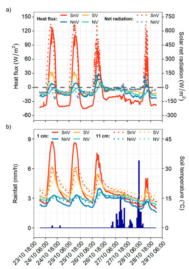 Figure 6 provides an insight into daily heat flux (Figure 6a) and temperature variations (Figure 6b) during a five days period with and without rainfall. Solar radiation is measured at 55 cm above the surface and heat flux at 8 cm depth in the slope. Temperatures are measured above and below the heat flux sensor, at 1 and 11 cm depth. During the selected period, SVC at SV and NV slopes was 0.75 and 0.90, respectively. By convention, heat flux is considered positive when entering in the soil.
