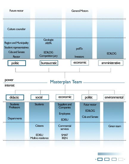 Starting from the power/interest grid, they performed the Stakeholder Management Web (Figure 4), which highlights the power and interest bases and the connections between the main stakeholders, allowing us to deeply understand the manifestations of the stakeholder’s actions and the intensity of their interest and power in the process. For example, from Figure 4, we can observe how students, professors and all academic staff represent stakeholders with the greatest interest as the principal users and beneficiaries of the new spaces, although they do not have any kind of power in terms of available resources to be allocated for the development of the project. As such, in the interests of social sustainability, the project should pay particular attention to their well-being and quality of life on campus, creating spaces fulfilling their needs and focusing on where they want to live and work. Furthermore, it emerges that the “Politecnico”, as an institution headed by the academic rector, the board of directors and the academic senate, represents the stakeholder with the greatest power in the decision-making process. Since the new project is aimed at creating a cultural symbol both for the campus (as a public institution) and for the city, it must be developed around objectives of public interest. Consequently, it should give particular attention to environmental and social sustainability, promoting an architecture that guarantees a sustainable relationship between users and the built environment. In other words, it means investing in the creation of spaces that guarantee the development of a sense of architectural identity and security, based on the concept of flexibility allowing long-term use for future instances and opportunities, and inspire interaction and social participation.