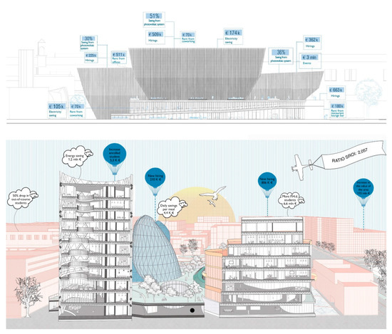The mandate of the Masterplan group also includes an integration of the process with educational and didactic objectives of the Politecnico itself [60]. This is why this case study was chosen in a workshop of design and urban economics at the MSc in Architecture (where the first author was the professor of the economic module and the second author was the collaborator), resulting in the elaboration of 16 projects developed in small groups, and as many applications of the evaluation scheme proposed in this paper. Within the real discussion of the general aspects of the “Polytechnic House of Culture”, the 59 students were asked to prefigure design solutions that address different aspects, from functional and symbolic instances to economic and energy performance. Above all, the new cultural centre should address the sustainability issue in its broadest sense, integrating technical aspects related to energy solutions, transport and waste management, with those relating to the well-being of students, professors and citizens towards whom the structure is open. Operatively, students were grouped and were asked to investigate the case study by performing the assessment framework proposed for identifying a valuable design solution.