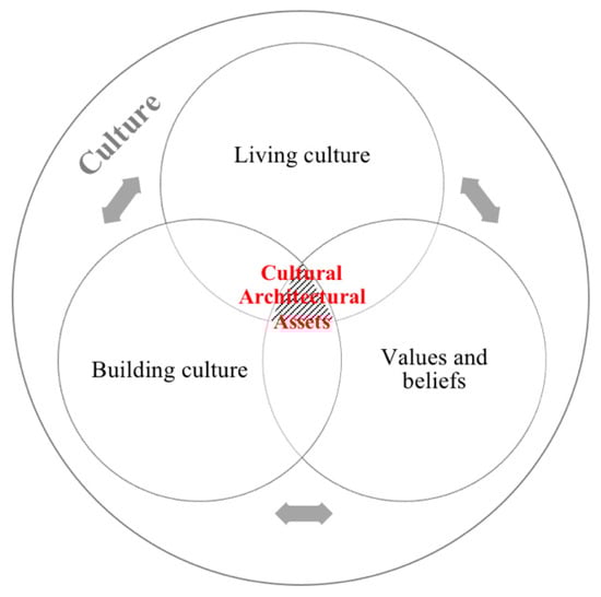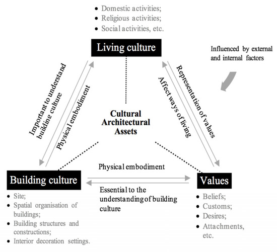 Henri Lefebvre holds that the production of space is divided into three dialectically dimensional processes: perceived, conceived and lived space [33]. His three-dimensional dialectic theory is adopted to form the theoretical framework of this paper—cultural architectural assets—for analysing interrelationships between architectural form, ways of living and culture in the process of change (Figure 1). It views cultural components as comprising living culture, building culture and values and beliefs, each of which are interrelated parts and cannot be analysed out of context. Culture is the concept in the framework relating to the vernacular architecture, and the traditional values and beliefs that are embedded in buildings and everyday use are part of that culture.