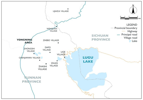 The research area of the study is limited to Mosuo villages in the Yongning region, in the Yunnan Province of southwest China. The fieldwork was undertaken over 41 days, from July–August in 2016. To understand the changes occurring, this research was underpinned by a comprehensive survey of nine Mosuo villages (Figure 2). The reason for selecting nine different Mosuo villages with varied geographical scope was in order to maintain a certain degree of generality and diversity in the collection of data.