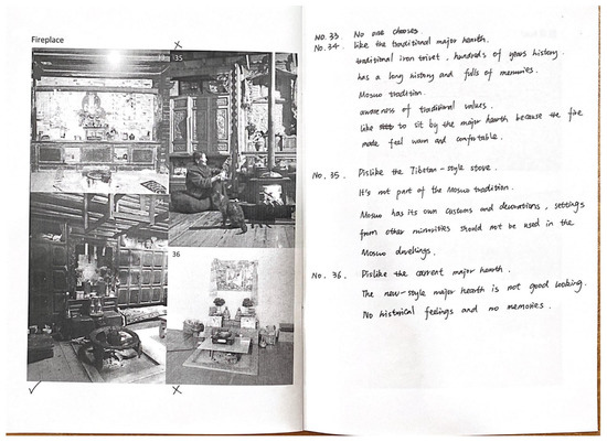 In particular, the participant in the photo elicitation interview was given a booklet to browse that showed selected photos showing traditional and current Mosuo dwellings and villages (Figure 3). Most of the photos in the booklet were taken during the fieldwork, but a few are archived photos from the Mosuo museum in Sichuan Province and the Mosuo Folk Custom Museum in Yunnan province, the National Library of China in Beijing and from historical literature. The participant then was asked to select photos, then answered questions and related stories linked to the photos they had selected. Questions included: Are there any photos you prefer in the booklet and why? Do these photos evoke memories or stories? Are there any photos you do not like, and why? Which photos do you think are the most representative of Mosuo dwellings? They may have also been asked about the reasons why they did not choose other photos. It took two or three days in total to conduct the interviews for each family, and the time allocated for each interview was one-hour. These investigations provided more insights into the transitions and the relationships between the dwellings, inhabitants and the Mosuo culture.