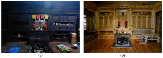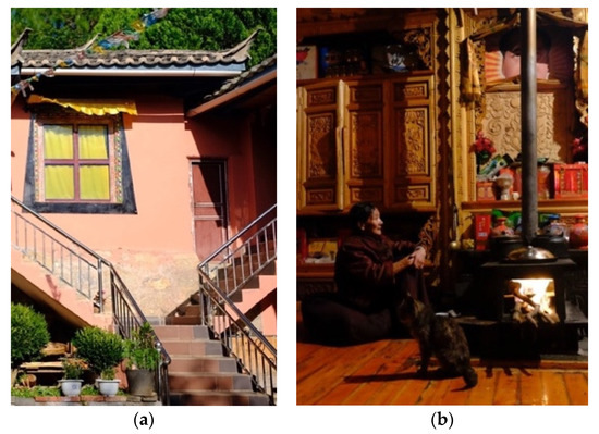 Regarding the core Mosuo values and beliefs, the main changes are reflected in the strengthening of religious belief, and the increased desire for modern ways of living and financial stability. Tibetan Buddhism has deeply influenced the exterior decoration of new buildings and the interior settings of the grandmother’s house, with features including Tibetan-style windows and Tibetan-style stoves (Figure 4).