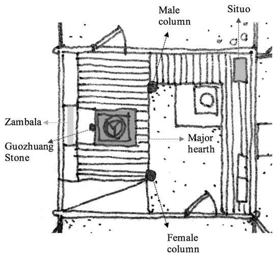 Additionally, building culture in the Mosuo dwellings has been retained in terms of spatial organisation, architectural structure, and interior decoration—features which are, in particular, reflected in the courtyard form and the grandmother’s house. Despite the appearance of multiple courtyards, the courtyard form still exists in today’s Mosuo dwellings as an enclosed form (Figure 5). This is because the courtyard mediates all domestic (including living and farming), religious and social activities of the Mosuo families. The courtyard organises buildings in a Mosuo house in an enclosed form that provides privacy and security, symbolising matriarchal harmony. Similarly, most of the architectural and interior settings of the grandmother’s house have been preserved in their form, function and meaning, including female and male columns, a major hearth, a Zambala, a Guozhuang stone and a Situo (Figure 6 and Figure 7).
