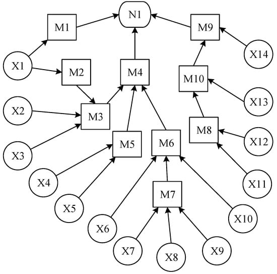 In the Bayesian network structure of Figure 1, the occurrence of X1 will directly affect M1, and then indirectly lead to the occurrence of N1. Take the Bayesian inference of this process as an example. The main purpose of this reasoning process is to analyze the degree of change in each state of X1 when N1i=yes, so as to find the state that has a greater impact on the collision accident. Since N1 and X1 are indirect relationships in the Bayesian network structure and cannot be solved directly, they need to be solved jointly with the Equation (6) on the basis of Equation (8). The calculation process is shown in Equation (9), where the solution of P(N1) is referred to Equation (7):