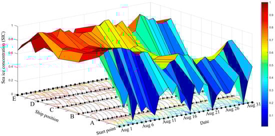 The database of the National Snow & Ice Data Center (NSIDC) contains a variety of physical data information in the Arctic waters. According to the needs of this research, satellite platforms DMSP 5D-3/F17 and DMSP 5D-3/F18 are selected and the “Near-Real-Time DMSP SSMIS Daily Polar Gridded Sea Ice Concentrations, Version 1” data product is obtained, and the relevant information is shown in Table 2. The data set divides the Arctic sea ice data into a grid of 448 rows × 304 columns, and the value is the daily average change of SIC within a 25 km × 25 km spatial coverage area. During data processing, the ship’s position information is the point coordinates, and the SIC data is the regional average. The average SIC data of the grid to which the ship’s position coordinates belong is used as the SIC data of the ship’s location.