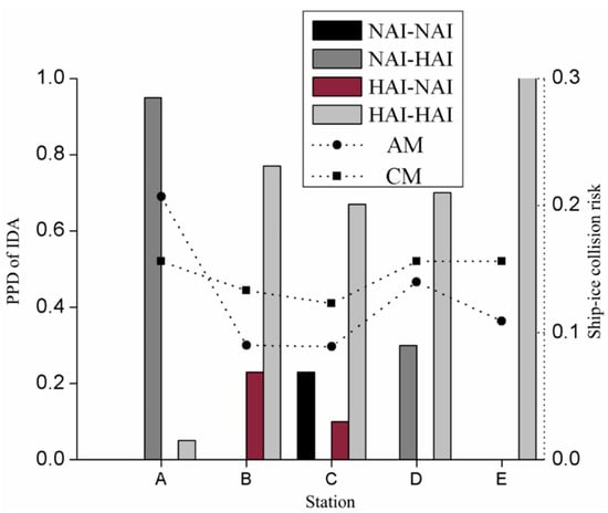 The probability of ship-ice collision on the selected route is around 0.15. Through the CM, the risk of ship-ice collision accident along the route are 0.16, 0.13, 0.12, 0.16, and 0.16. By using the AM, the risk of ship-ice collision accident are 0.2, 0.09, 0.09, 0.14, and 0.11. The risk change trends calculated by the two models are basically the same, but at the same location, the model analysis results under the SDA are more sensitive to ice condition. At station A, the risk assessment result of the AM is 32.69% higher than that of the CM. At station B, C, D, and E, the risk assessment results of the CM are higher than that of the AM, which are 32.33%, 27.64%, 10.26%, and 30.13%, respectively.