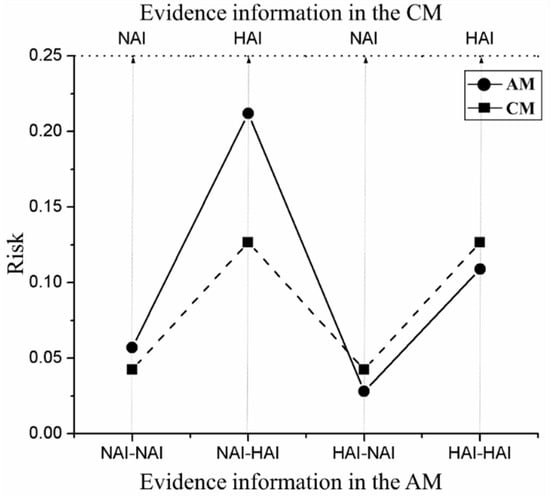 - When the evidence information in AM and CM are P(HAI-NAI) = 1 and P(NAI) = 1, P(HAI-HAI) = 1 and P(HAI) = 1 respectively, the risk assessment results in the AM are lower than those in the CM.