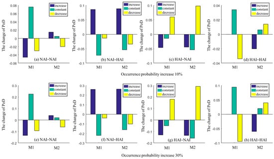 The change of PoD in M1 and M2 under the variation of SDA. Among them, (a–d) means that the SDA states of NAI-NAI, NAI-HAI, HAI-NAI, and HAI-HAI increase by 10% respectively, (e–h) means that the SDA states of NAI-NAI, NAI-HAI, HAI-NAI, and HAI-HAI increase by 30% respectively.