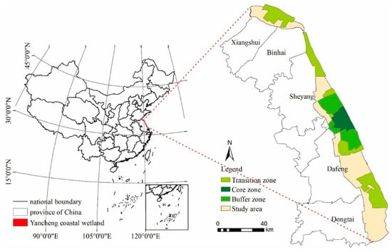 Yancheng Coastal Wetland is located in the central coastal area in Jiangsu Province (32°34′–34°28′ N, 119°48′–120°56′ E) (Figure 1). The wetland characterizes subtropical monsoon climate, sufficient rain and heat energy. Most rivers flow from west to east and finally enter into the Yellow Sea. Moreover, there are diversified natural resources along tidal beaches, including wetland, water and marine ecosystems. Yancheng Coastal Wetland has diversified and abundant plant and animal resources. The shoreline of Yancheng Coastal Wetland accounts for 60% of total shoreline in Jiangsu Province, which also reflects its important position in marine economy of Jiangsu Province. In 2017, the gross domestic product (GDP) in Yancheng district reached 508.269 billion yuan, which was 9.17% higher than that in 2016. In this present study, the study area of Yancheng Coastal Wetland was chosen based on the requirements as follows: Main roads and rivers in the City of Yancheng were chosen as the landward boundary of the study area, while the land boundary of the coastal wetland map covered by the maximum landscape covered was slightly expanded toward the sea area as the seaward boundary of the study area. The north region was bordered at the Guanhe River while the south region was determined at the administrative border of the southern Yancheng City [38]. The whole study area was about 3402.49 km2, covering the biological protection zone of Yancheng Wetland, including a core zone, buffer zones and transition zones.